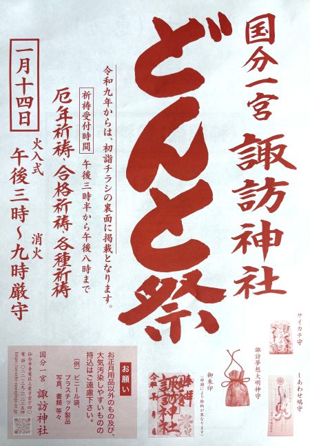 14日のどんと祭に先立ちまして、1月10日(土)からどんと祭斎場を解放いたします(9時~17時)14日当日の都合がつかない方は、その時間内にお納めください